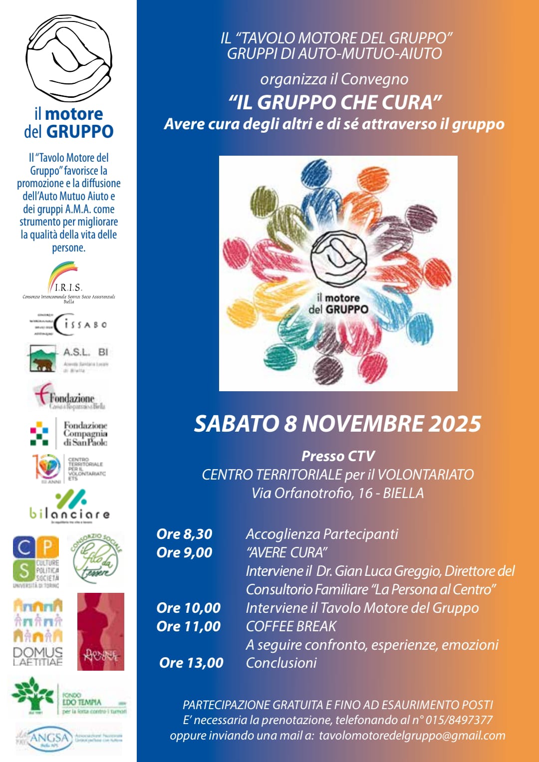 Il Tavolo Motore del Gruppo - Auto Mutuo Aiuto Biella, organizza il Convegno “Il gruppo che cura”, rivolto alla cittadinanza.